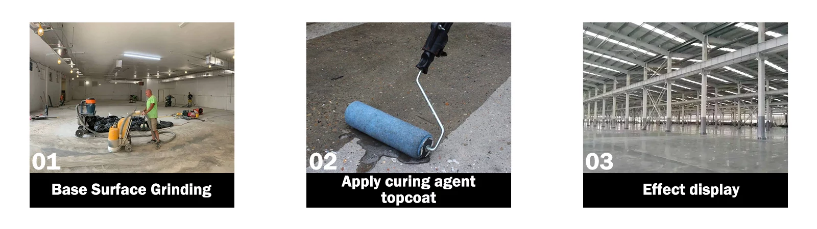 2. Spraying the curing agent: Apply the material evenly across the floor, ensuring full saturation.