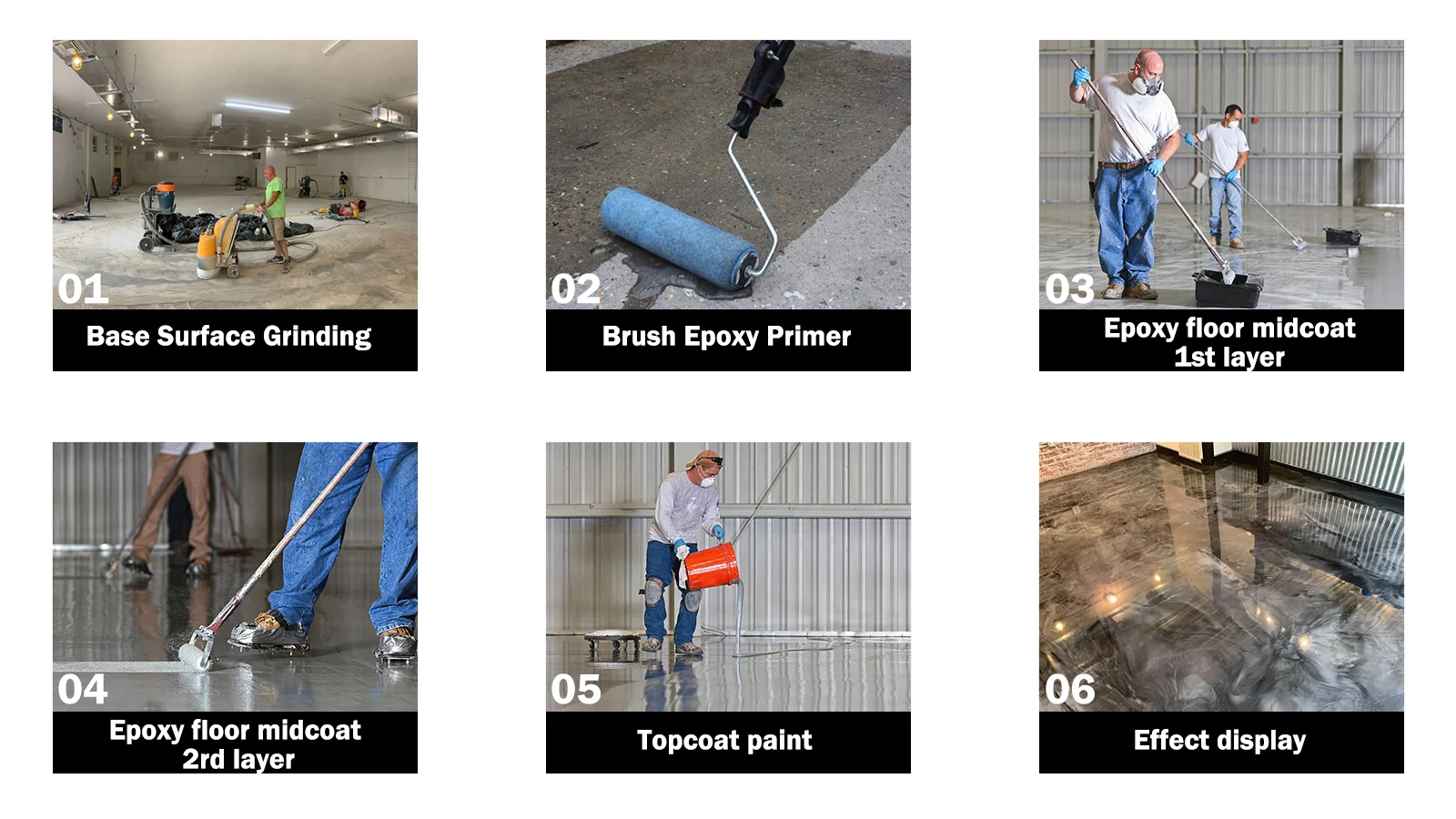3. Epoxy Intermediate Coat Application: Apply epoxy intermediate coating by trowel, evenly distribute metallic powder or lay metallic flakes to create a distinctive metallic texture and visual effect.