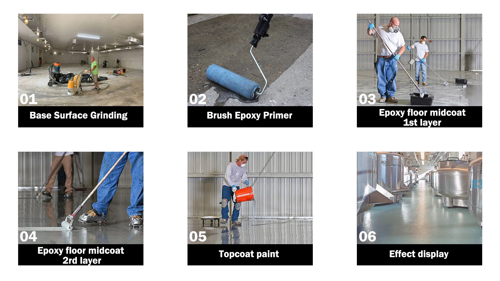 6. Epoxy Topcoat: Applied via trowel or roller coating to form a dense protective layer, ensuring the overall performance of the flooring system;
